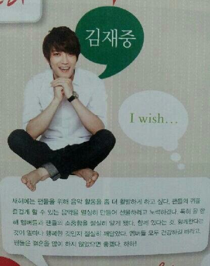 Pour le bien des fans, je veux être plus proactif pour mes activités musicales cette année. J’écrirai plus de chansons qui seront plaisantes pour l’oreille, comme cadeaux pour les fans. Spécialement cette année, j’ai personnellement senti la mignardise de mes membres et de mes fans. Je comprends aussi qu’être ensemble et continuer à avancer ensemble est une vraie bénédiction. J’espère que les membres sont en bonne santé. Et ça serait bien si pas trop de fans partaient et se mariaient. Haha !