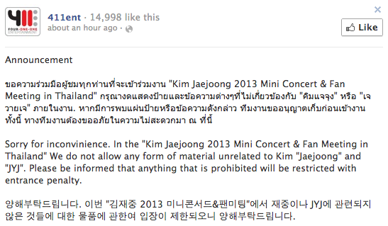 [TRAD] Excusez-nous pour le dérangement. Pour le ‘Kim JaeJoong 2013 Mini Concert & Fan Meeting in Thailand’ Nous n’autorisons pas les objets, quel que soit le format, qui ne sont pas en relation avec Kim ‘JaeJoong’ et ‘JYJ’. S’il vous plait, comprenez que tout ce qui n’est pas autorisé sera interdit d’accès avec des pénalités d’entrée.